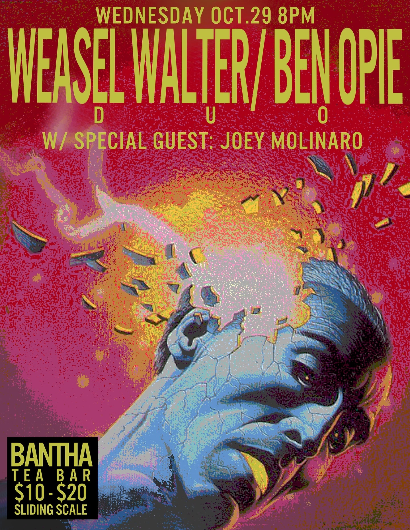 Improvised experimental set from Weasel Walter & Ben Opie, with special guest Joey Molinaro. Concert at Bantha Tea Bar $10 / $20Ben Opie Joey Molinaro Bantha Tea Bar Experimental Improvised Music