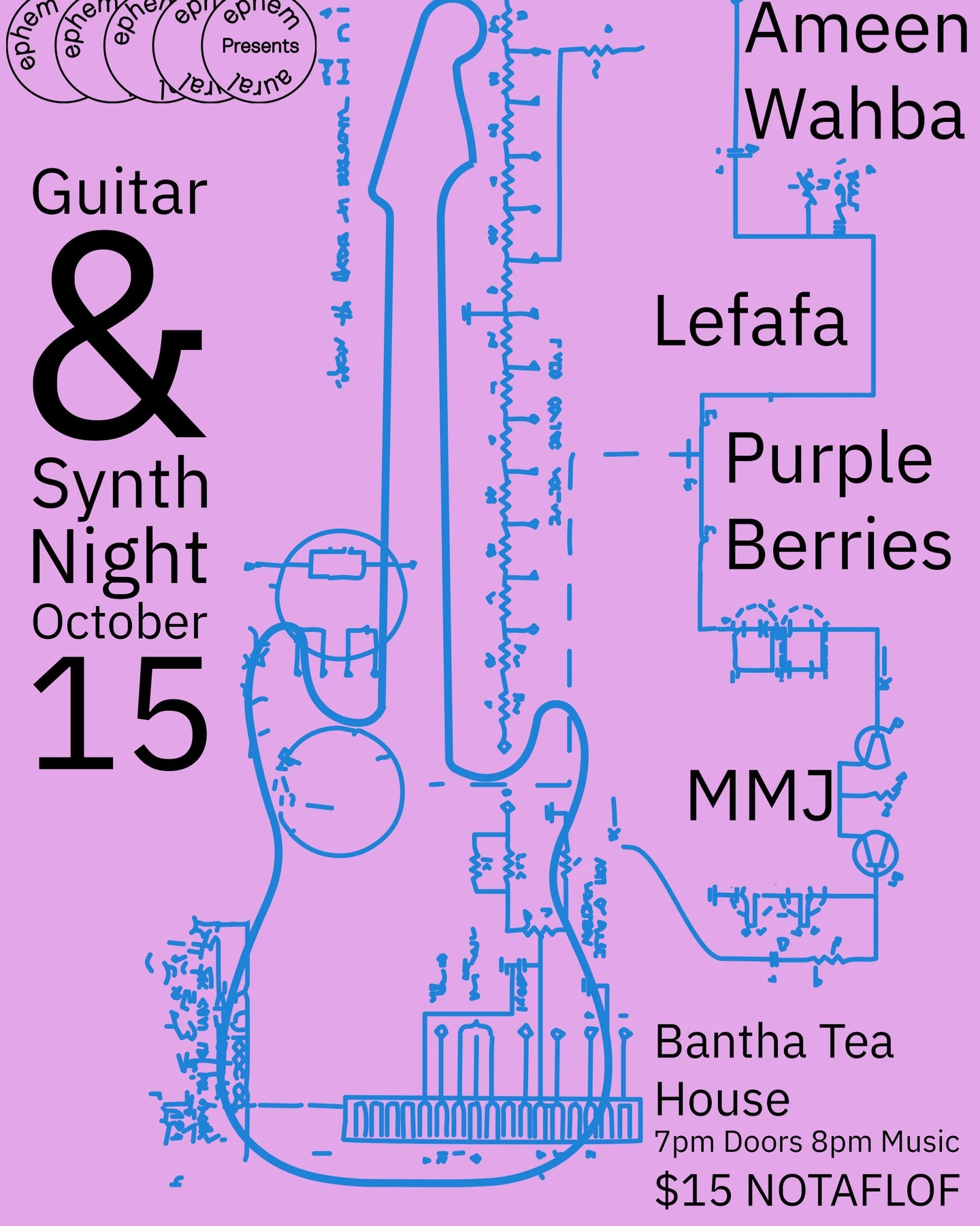 A night of guitar and synth performances featuring Ameen Wahba, Lefafa, Purple Berries, and MMJ. Concert at Bantha Tea Bar All Ages $15 / $15 -