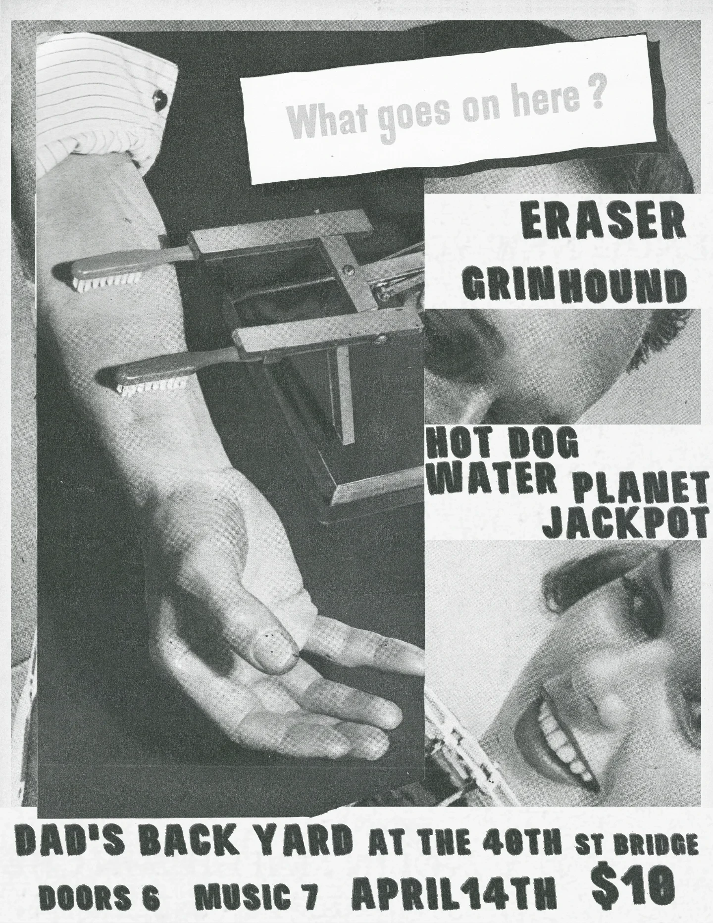 Four-band rock showcase at Dad's Back Yard featuring Eraser, Grinhound, Hot Dog Water, and Planet Jackpot.