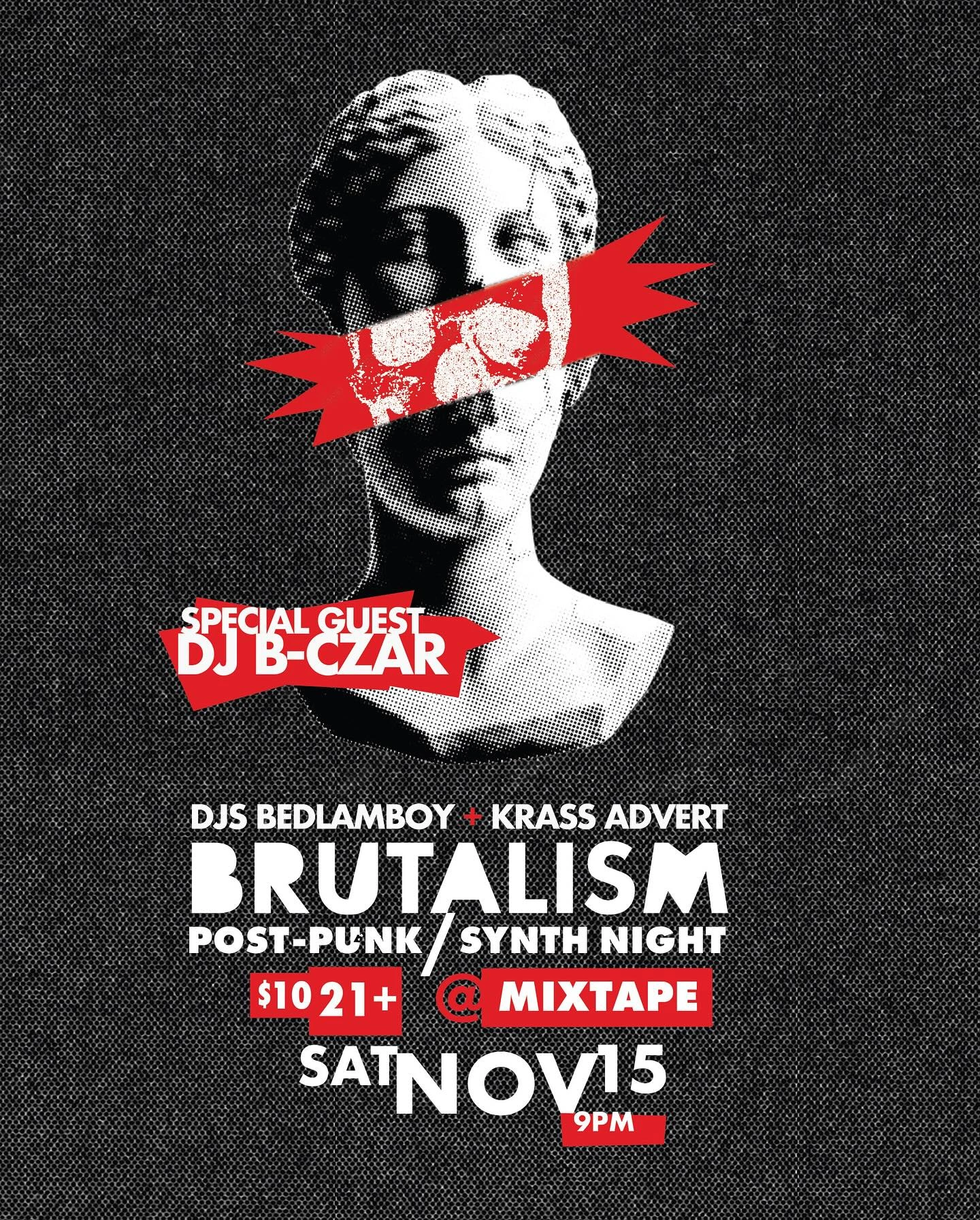 Brutalism series Post-punk and synth night at Mixtape with DJs Bedlamboy, Krass Advert, and guest DJ B-Czar. Club Night at Mixtape 21+ $10 -