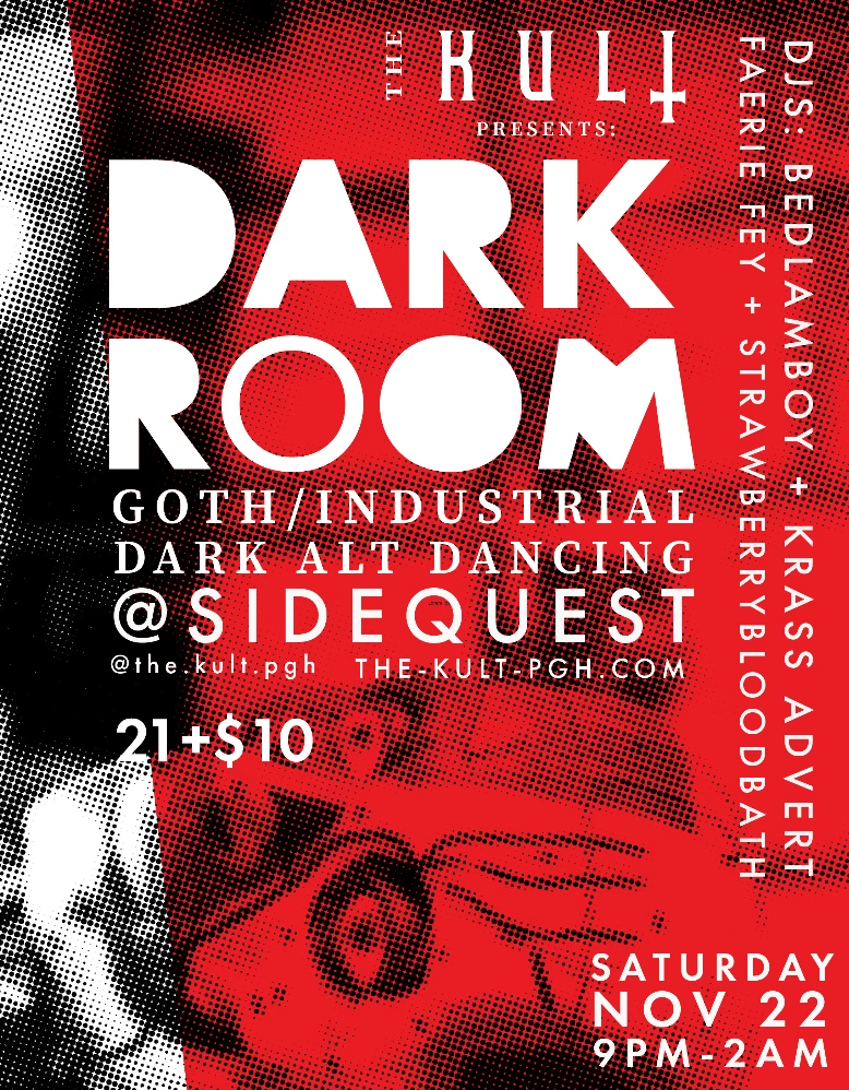 Goth/industrial dark alt dance party at Side Quest from The Kult. Club Night at Side Quest 21+ $10 / $10Side Quest The Kult Bedlamboy Krass Advert DJ Faerie Fey Strawberry Bloodbath Goth Industrial