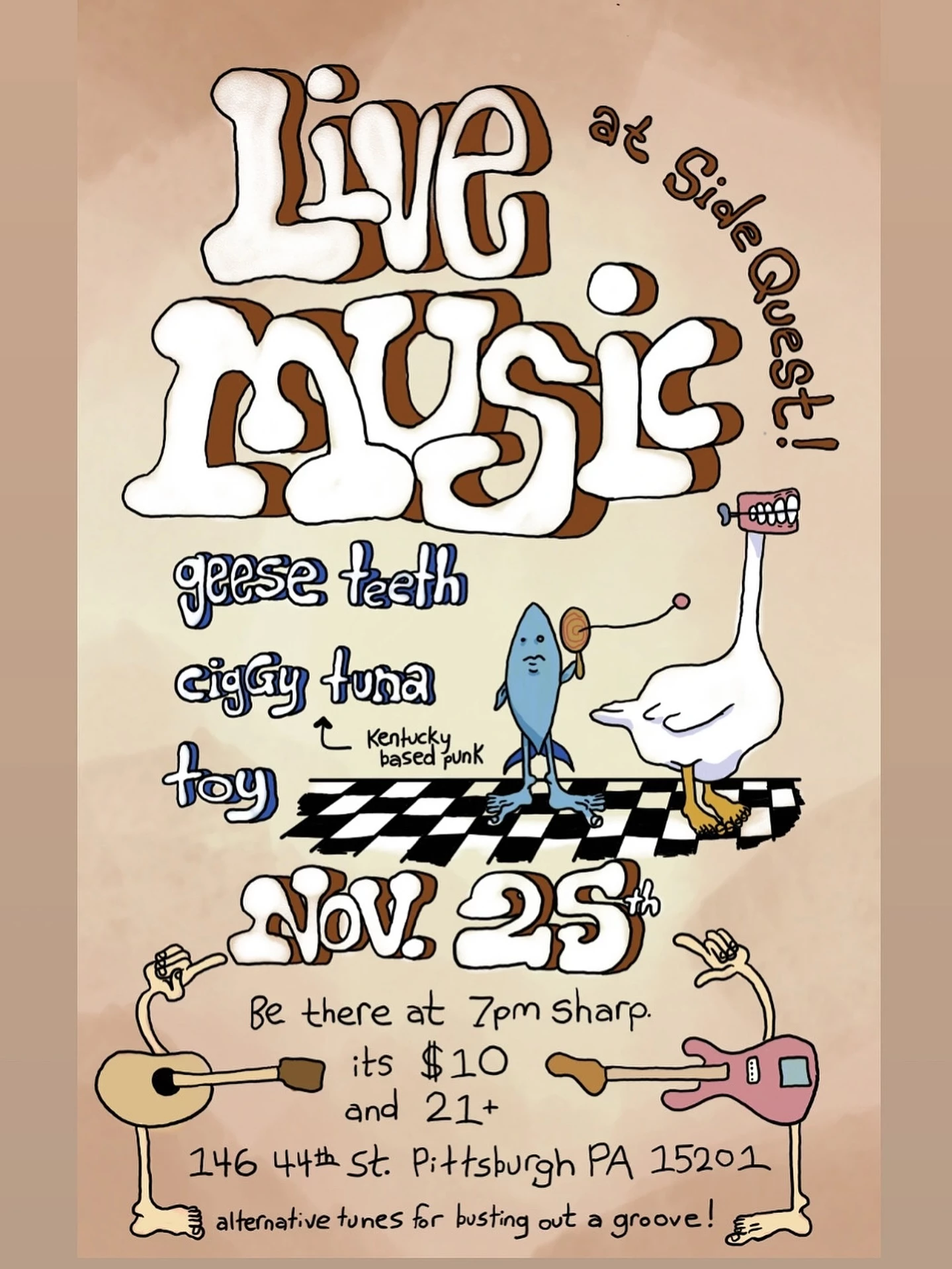 Live punk and alternative music at Side Quest with Geese Teeth, Ciggy Tuna (KY), and Toy.