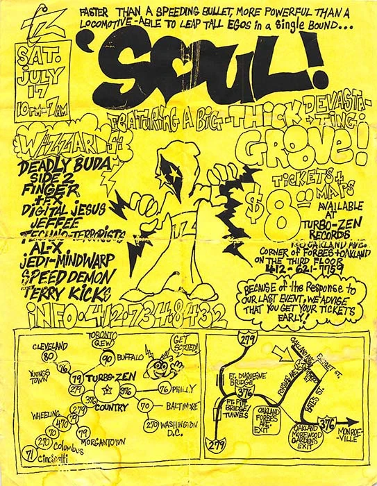 On July 24, 1993, the Pittsburgh underground came alive with 'Soul!', a high-voltage rave organized by Turbo-Zen to mark their one-year anniversary. This celebration featured a stacked lineup of regional and local DJs including Deadly Buda, Side 2, Finger, +FX, Digital Jesus, Jeffee, Techno-Terrorist, Alex J, Jed X, Speed Demon, and Terry Kicks. With visual art, sideshows, circus acts, and audio chaos, the event promised full sensory immersion. The flyer also mentioned a premiere of the 'HEAD? NOZ!' zine and custom-built sound powered by Chujo Bros and Klipsch stacks.