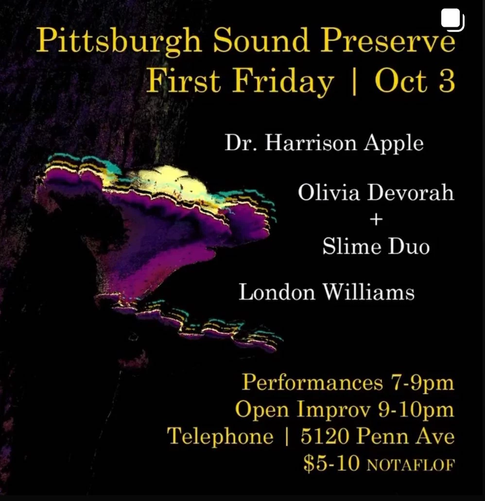 Experimental and improvised music showcase with Dr. Harrison Apple, Olivia Devorah + Slime Duo, and London Williams. Concert at Telephone $5 / $10 -