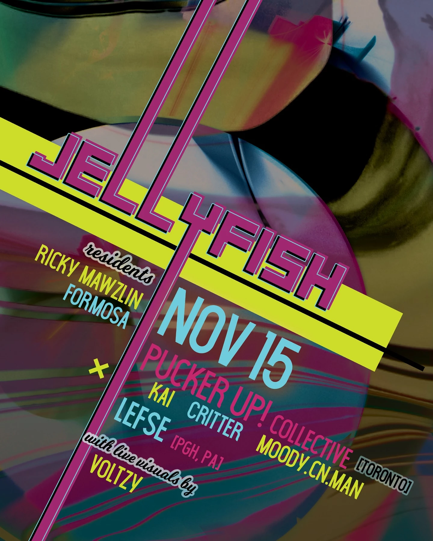 Toronto’s PUCKER UP! crew joins Jellyfish for a special queer dance party at Side Quest. Club Night at Side Quest 21+ $15 / $18Jellyfish Lefse Formosa Ricky Mawzlin Electronic Queer House Italo Disco