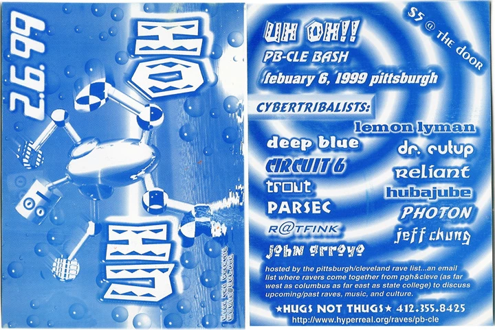 PB–CLE Bash bringing together Pittsburgh and Cleveland rave crews, Feb 6, 1999. Rave at The Paintball Arena All Ages $5Cutups Keebs The Paintball Arena Hardcore House Jungle Rave Techno Trance