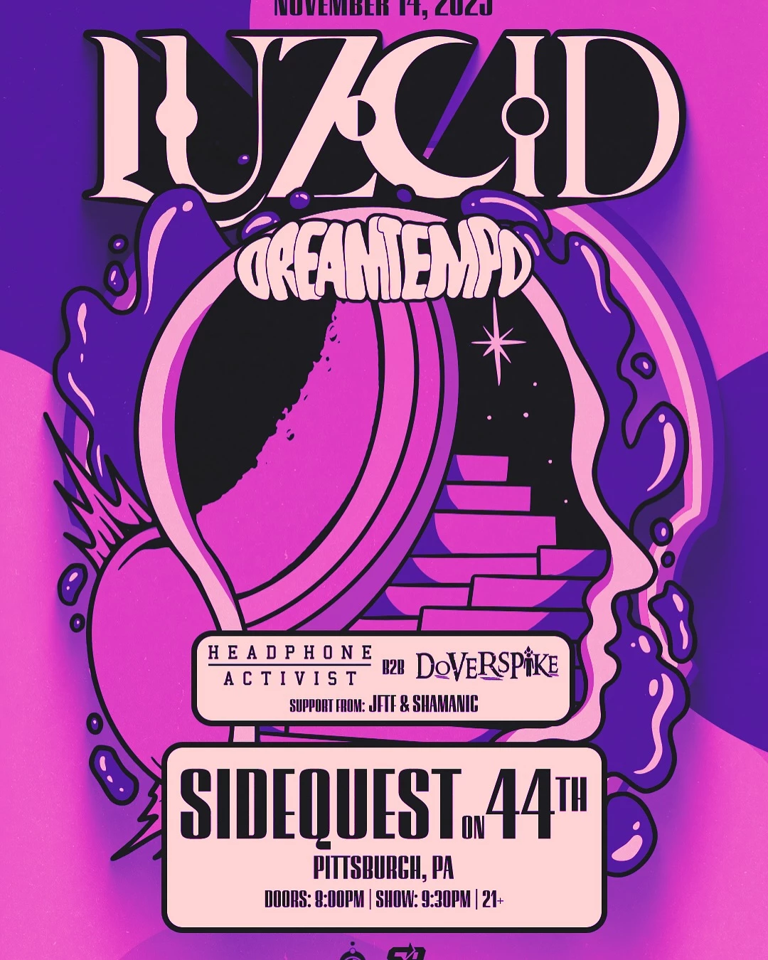 Luzcid brings his Dreamtempo tour to Sidequest with Headphone Activist b2b Doverspike, plus support from JFTF & Shamanic. Club Night at Side Quest 21+Side Quest Doverspike Headphone Activist JFTF Electronic Bass Dubstep
