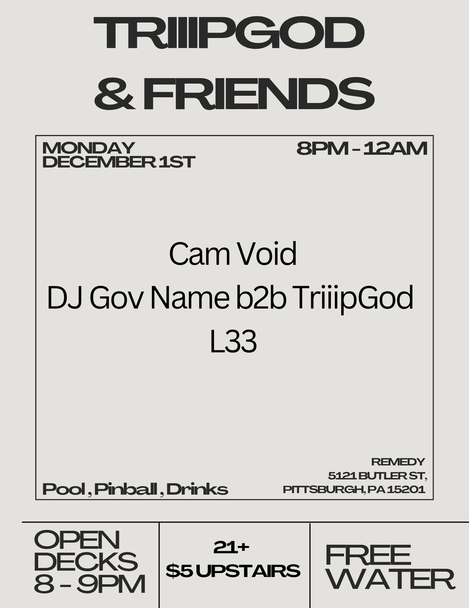 Electronic and bass night at Remedy with TriiipGod, DJ Gov Name, Cam Void, and L33. Club Night at Remedy 21+ $5 -