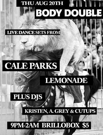 10:00 PM - 2:00 AMCale Parks (live) and Lemonade (NY) plus djs Cutups, Kristen and A Grey