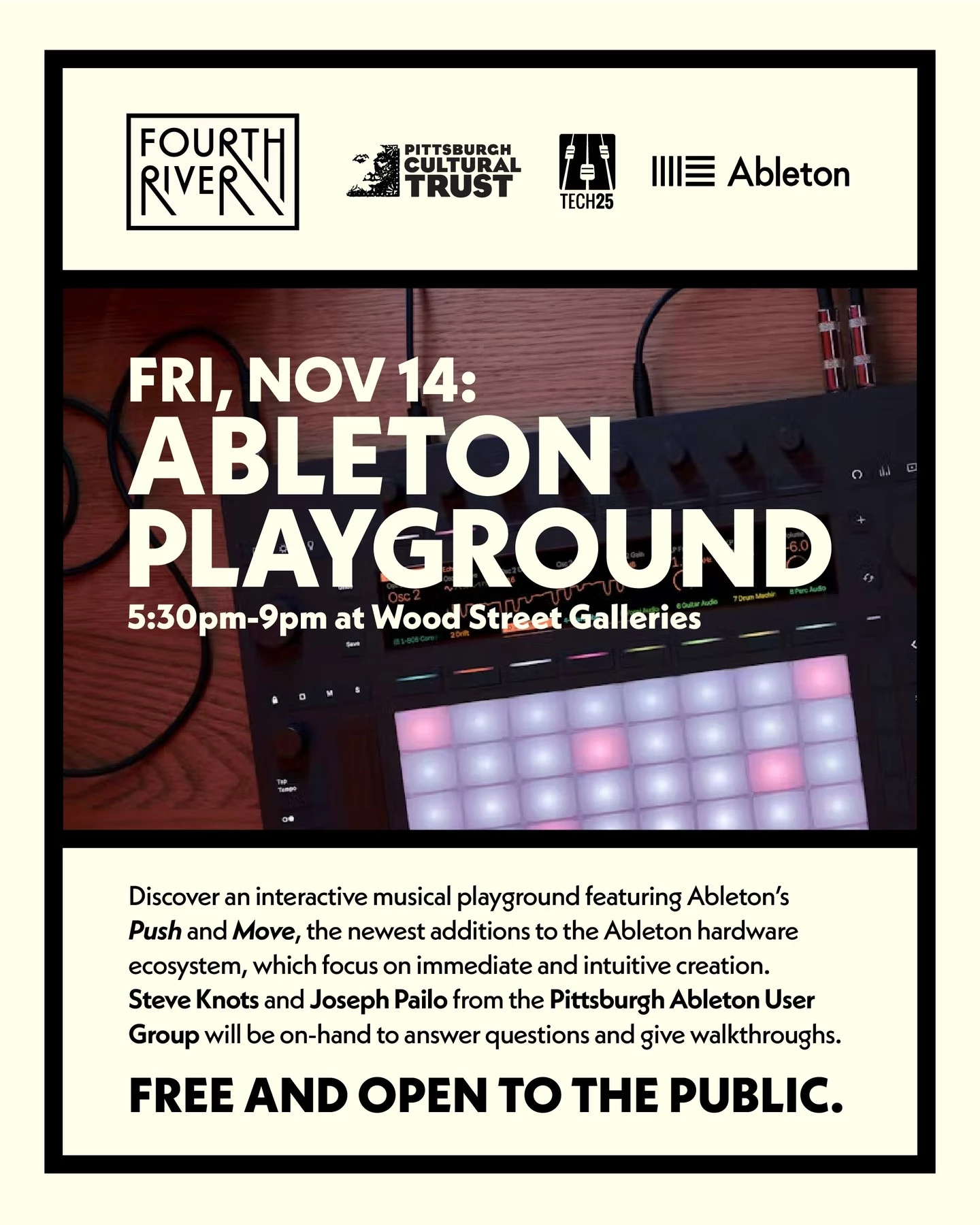 Hands-on workshop exploring Ableton’s Push and Move controllers. Workshop at Wood Street Galleries All Ages $0Wood Street Galleries Pittsburgh Cultural Trust Electronic Production
